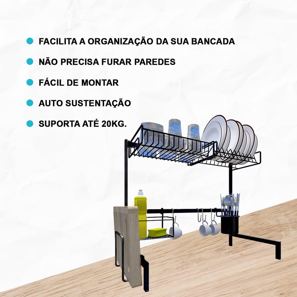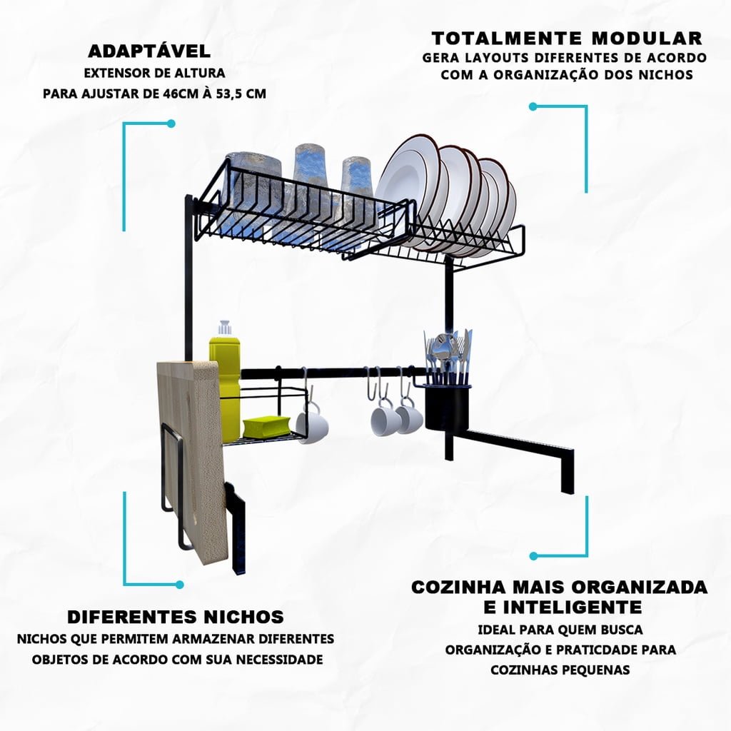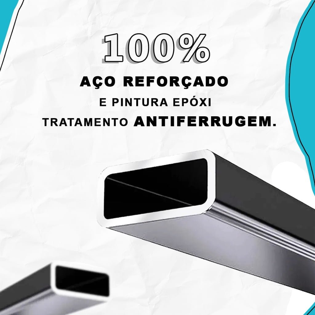 Fabricado com materiais de altíssima qualidade e durabilidade, este produto é composto por Aço Carbono Reforçado com acabamento em pintura Epóxi – a mesma da sua geladeira – Que não enferruja ou mancha. Possui pés para auxiliar na estabilidade do produto, garantindo mais segurança e suportando até 20 kg, além de ser super fácil de montar devido ao sistema de encaixe, que dispensa furos na parede e permite ajustar a altura de 46 à 53,5cm e regulagem que possibilita a utilização em bancadas e/ou pias com torneiras.