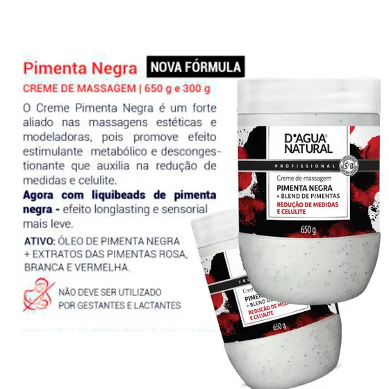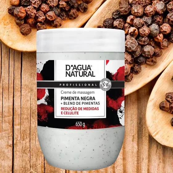 Este creme com óleo de pimenta negra, termogênico de origem natural, é indicado para massagens modeladoras