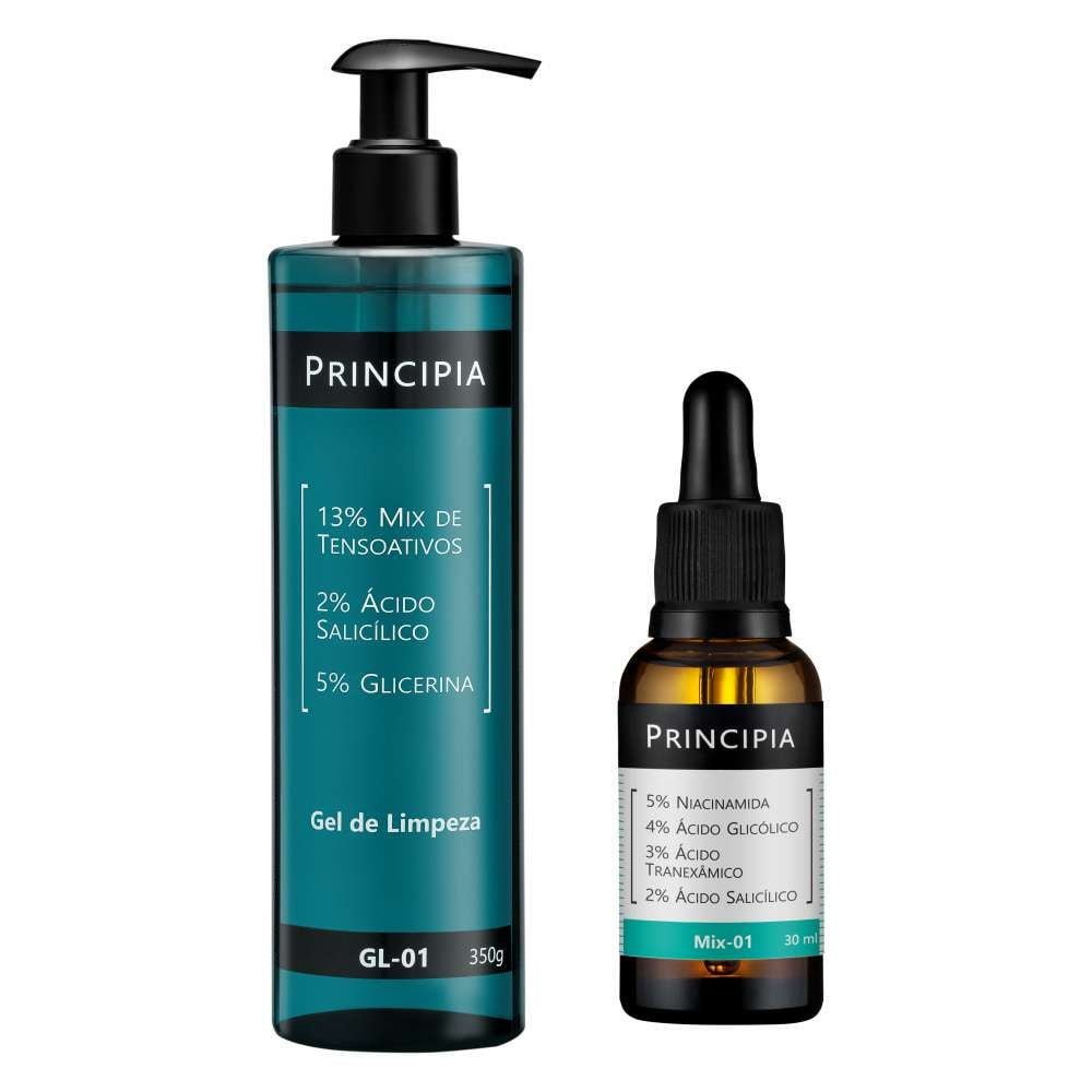 Kit com um gel de limpeza com 2% de Ácido Salicílico e 5% de Glicerina e um sérum Mix-01 com associação de quatro ativos com alta eficácia na melhora da acne e controle da oleosidade da pele.